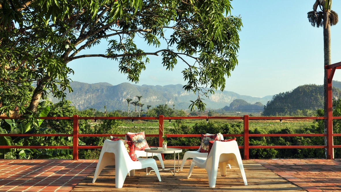 A quelques kilomètres du centre du village de Viñales, une maison dans le style traditionnel des campagnes cubaines, construction en bois et toit en chaume. Pas de climatisation, la circulation de l'air est naturelle. On profite des espaces confortables face aux fameuses mogotes pour déguster un rhum et un cigare de la région.