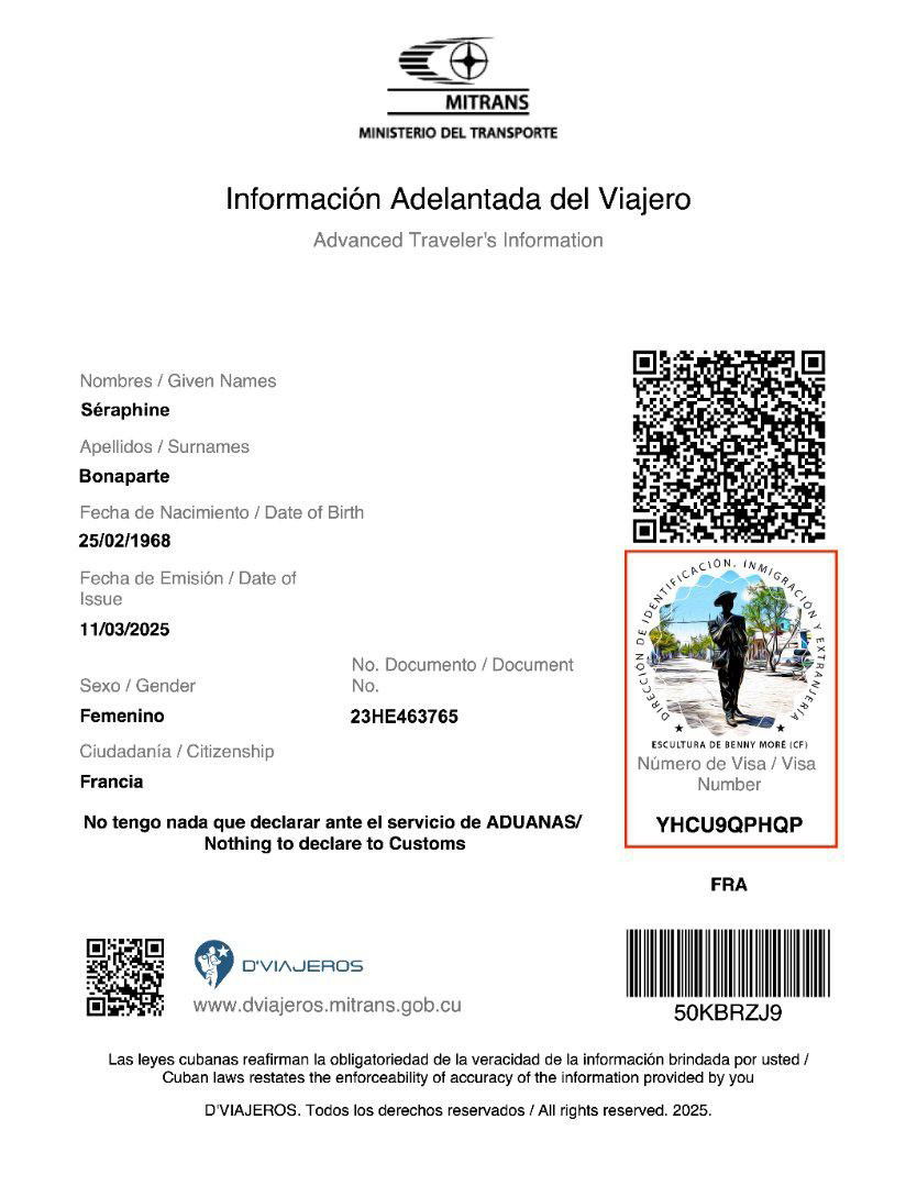 Le nouveau e-Visa, mis en place depuis quelques mois, est délivré par e-mail contenant un lien à la déclaration D’Viajeros à remplir par chaque voyageur. Ce lien est reçu après le paiement du e-Visa. Son prix officiel est de 22 € pour l’UE. Caraïbe Autrement fournit ce e-visa systématiquement à tous ses voyageurs.